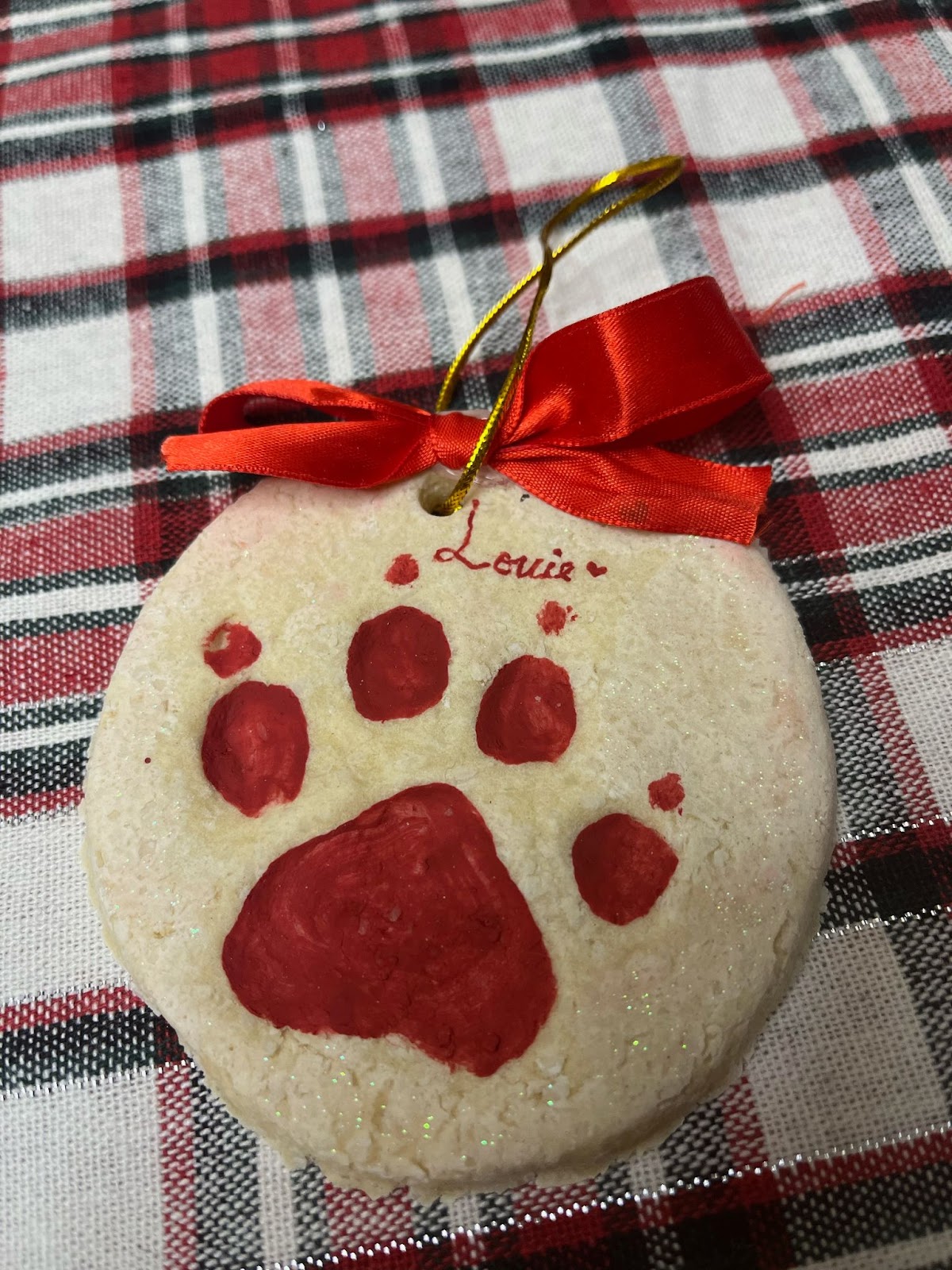I first made one of these paw print ornaments for my Golden Retriever, Abby, about 12 years ago. She was the best dog, like Santa she was always merry and loved cookies. When she was a puppy, I decided I wanted to immortalize her cute little puppy paw print in an ornament. As a kid, I did not have a lot of resources to buy the fancy ornament kits from the craft store so I had to figure out another option. Luckily my mom came to my rescue and told me about this DIY method, using supplies we already had in the house. She had originally used this recipe to make handprint ornaments for my brother and I when we were babies so I figured it would probably work for a dog as well. My instincts were right and the ornament turned out so cute, I even wrote Abby’s name and the date on it as well. Straight on the tree it went. It may not have been the prettiest ornament on the tree but as Abby grew older it became even more special. Eventually, Abby passed over the rainbow bridge and now that ornament is more important to me than ever. It is always bitter sweet when December rolls around and I get to see her little puppy paw print again.